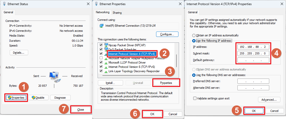 2. Jeżeli po restarcie mikrotika nie usuniesz konfiguracji, mikrotik będzie posiadał domyślny adres IP 192.168.88.1 z maską 255.255.255.0 (adres i maskę zapisuje się razem jako 192.168.88.1/24). Możesz połączyć się do niego jeżeli twój komputer znajduje się w tej samej sieci. Skonfiguruj swój adres IP w ustawieniach systemu Windows. Uruchom w wierszu poleceń ncpa.cpl