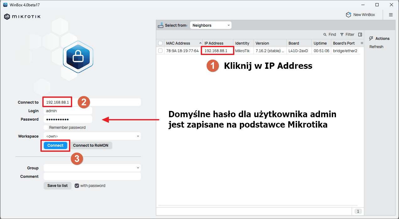 1. Zaloguj się do mikrotika z wykorzystaniem aplikacji WinBox. Kliknij w MAC Address, wpisz , użytkownika admin i hasło. Jeżeli usunąłeś domyślną konfigurację użytkownik admin nie ma hasła (puste pole password). Jeżeli mikrotik posiada domyślną konfigurację, hasło znajduje się na podstawie (dole) mikrotika.