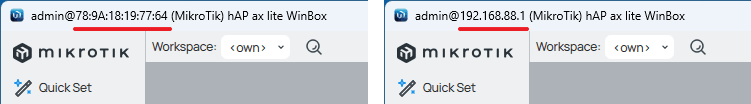 5. Sposób połączenia zaobserwujesz w górnej listwie aplikacji WinBox po podłączeniu.
