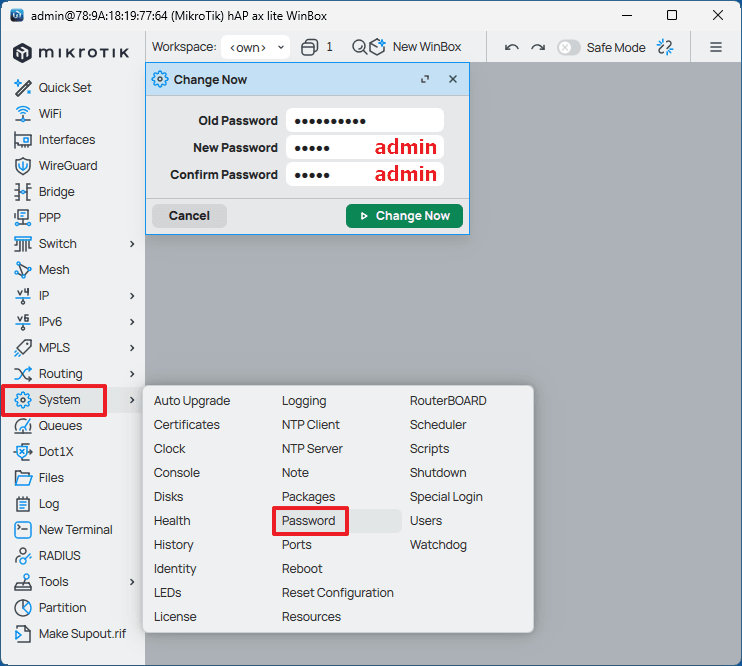 6. Natomiast na potrzeby szybkiego dostępu do konfiguracji mikrotika (w laboratoriach) ustaw hasło admin dla użytkownika admin, wybierz System / Password (zmienia hasło aktualnie zalogowanego użytkownika).