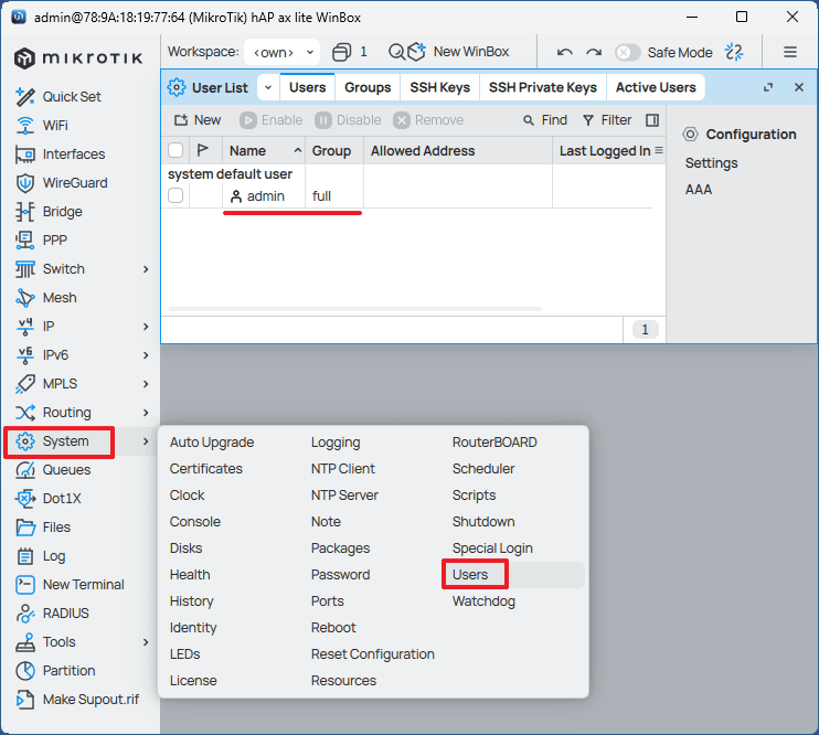 Ze względów bezpieczeństwa konto o najwyższych uprawnieniach powinno mieć hasło, które trudno złamać. Zaleca się też, żeby utworzyć innego użytkownika, nadać mu uprawnienia grupy full (takie jakie posiada użytkownik admin) i usunąć użytkownika admin. Tak należy postępować przy konfiguracji mikrotika w domu, w firmie.