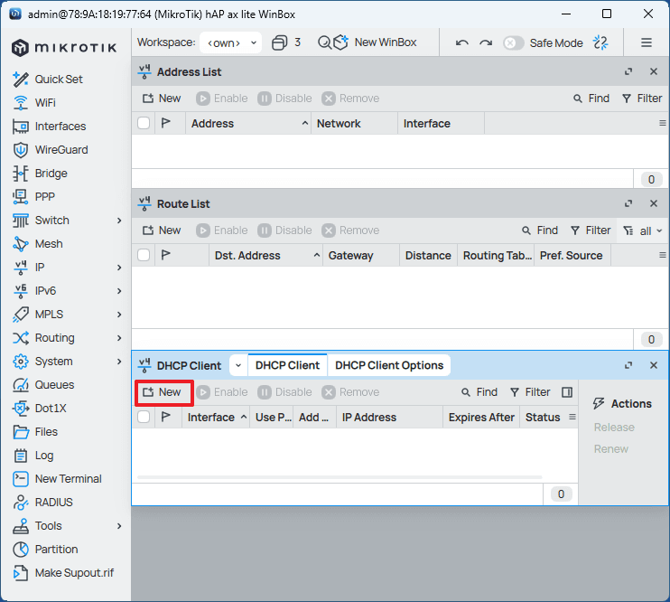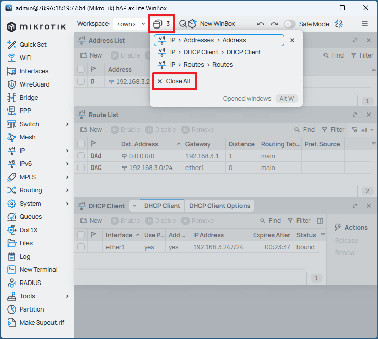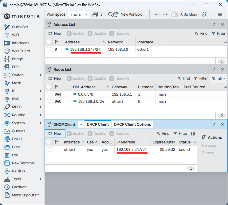 13. Zaobserwuj, że w oknach Address List oraz w oknie DHCP Client pojawił się adres IP przydzielony do interfejsu ether1. Natomiast w oknie Route List zostały utworzone 2 trasy routingu.