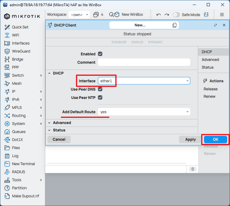 12. W oknie DHCP Client sprawdź czy jest wskazany port ether1 (jako klient pobierający od dostawcy adres IP) oraz czy jest zaznaczona opcja Add Default Route (dodanie domyślnej trasy routingu). Zatwierdź swój wybór wybierając OK.